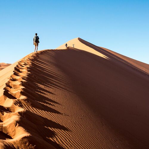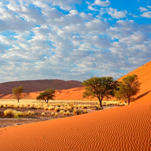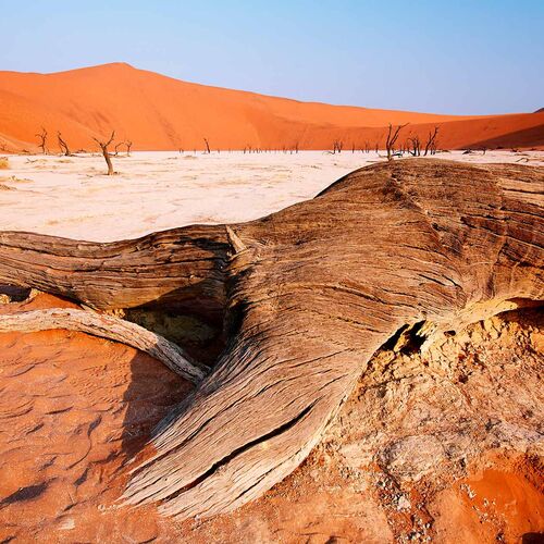 Det sydvestlige Namibia er helt domineret af Namib-ørkenen, hvoraf hovedparten er beskyttet af den mægtige Namib-Naukluft Park, der dækker 6% af landet og med knap 50.000 km2 er Afrikas største, og dermed blandt verdens allerstørste nationalparker. Parken er nok mest kendt for området nær Sesriem i den østlige del ca. 300 km syd for hovedstaden Windhoek og især Sossusvlei og Deadvlei, der er de mest spektakulære af en række oftest udtørrede vandflader. De ligger nemlig blandt nogle af verdens højeste og smukt orange-røde klitter på over 300 meter. Adgangen hertil sker i parkens specialfremstillede køretøjer, hvorefter man bliver ”sluppet fri” og til fods kan udfordre de store sand-bjerge for at finde den perfekte udsigt og tage de ultimative ørkenbilleder. Dette gøres allerbedst tidligt om morgenen, så man kan se solen stå op over området og nyde det spektakulære ”lys-show”, når skarpt aftegnede skygger bliver fortrængt af det bløde gyldne morgenlys. Har man lyst og kræfter, kan man gå op på toppen af klitterne for at få den optimale udsigt, men det kan være hårdt at gå i det løse sand selv om morgnerne, hvor her er køligst.