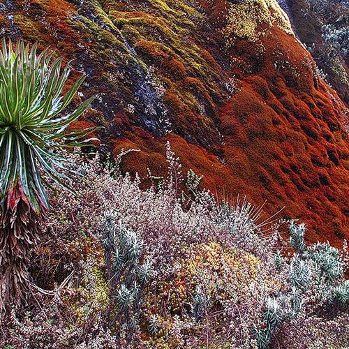 Bjergene er på Uganda-siden beskyttet som en nationalpark fra knap 2.000 meters højde, hvor der er tæt skov. Længere oppe fra omkring 2.500 meters højde dominerer store bambusskove, mens først lyngskove og højere oppe den helt specielle afro-alpine hedevegetation med mærkværdige kæmpeurter, der tager over. Sidstnævnte har sin største udbredelse her i Ruwenzori, men kan også ses på de andre høje bjerge i Østafrika. Nationalparken rummer adskillige store dyr, men man skal ikke regne med at se disse og må typisk ”nøjes” med et par abearter og en del fugle.