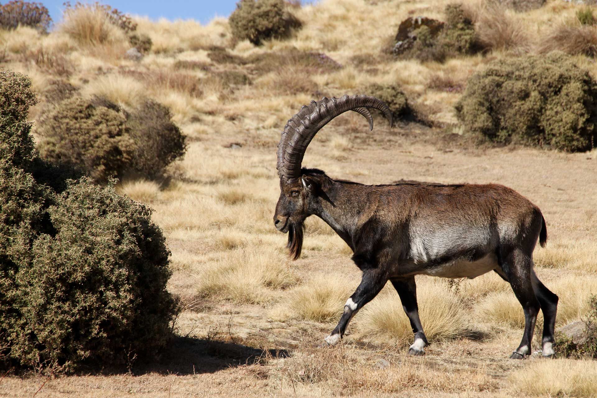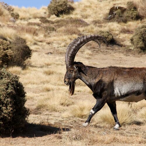 Omkring disse lever et af områdets specielle dyr i store flokke, nemlig den meget langhårede gelada bavian. Hannerne er kendte for deres signalering, hvor de krænger læberne vidt til side og blotter deres lyserøde tandkød og de overordentlige lange hjørnetænder. Trods denne adfærd, der også kan se truende ud overfor os mennesker, er geladaerne fredelige planteædere, og man kan trygt sidde midt i de store grupper og nyde deres laden og gøren. Vil man se en anden af dyrespecialiteterne, den store ged Walia ibexen med de gigantiske bagudkrummede horn, må man længere ind i parken omkring Chenek. Her er det også muligt at se den sjældne etiopiske ulv, der dog er mere hyppig i Bale Mountains nationalparken. Simienbjergene rummer også flere fuglespecialiteter, hvor især den kæmpestore lammegrib og den imponerende tyknæbbede ravn kan fremhæves, da de er markante og nemme at se netop her.
